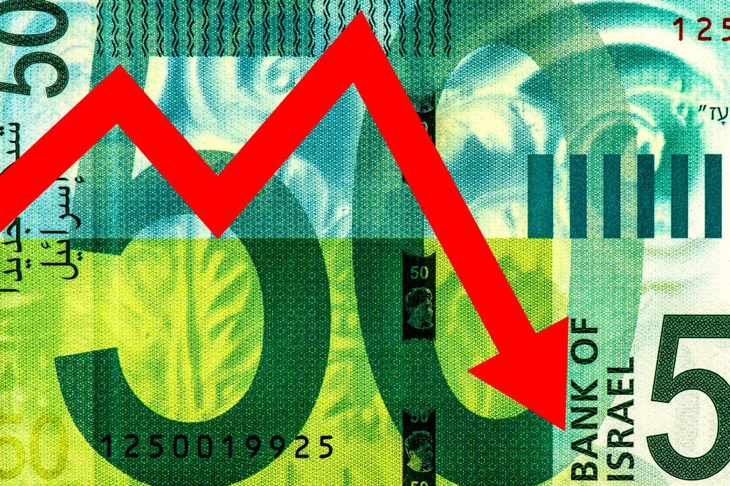 تراجع سعر صرف الشيكل الإسرائيلي أمام الدولار واليورو في بداية تعاملات الأسبوع بعد قرار وكالة موديز للتصنيف الائتماني خفض تصنيف إسرائيل.