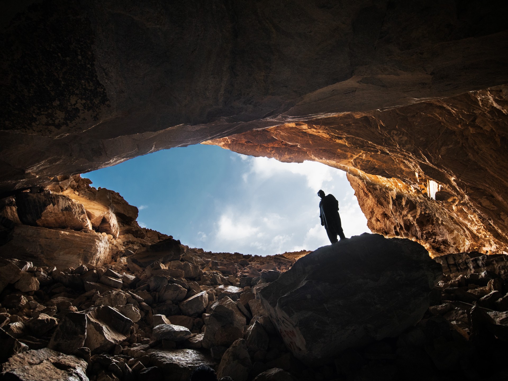 Riyadh, November 13, 2020. Tourists visit the bat cave near Edge of the World Tuwaiq escarpment, Saudi Arabia