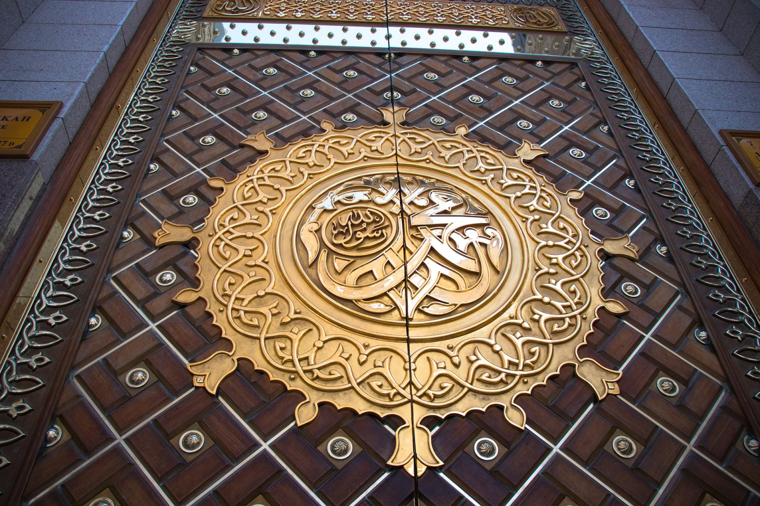 إذ صُنعت هذه الأبواب بأكثر من 1600 متر مكعب من خشب (الساج)، استهلك الباب الواحد منها أكثر من 1500 قطعة مذهبة منقوشة، جُمعت في قالب دائري تحتوي على اسم (محمد رسول الله).