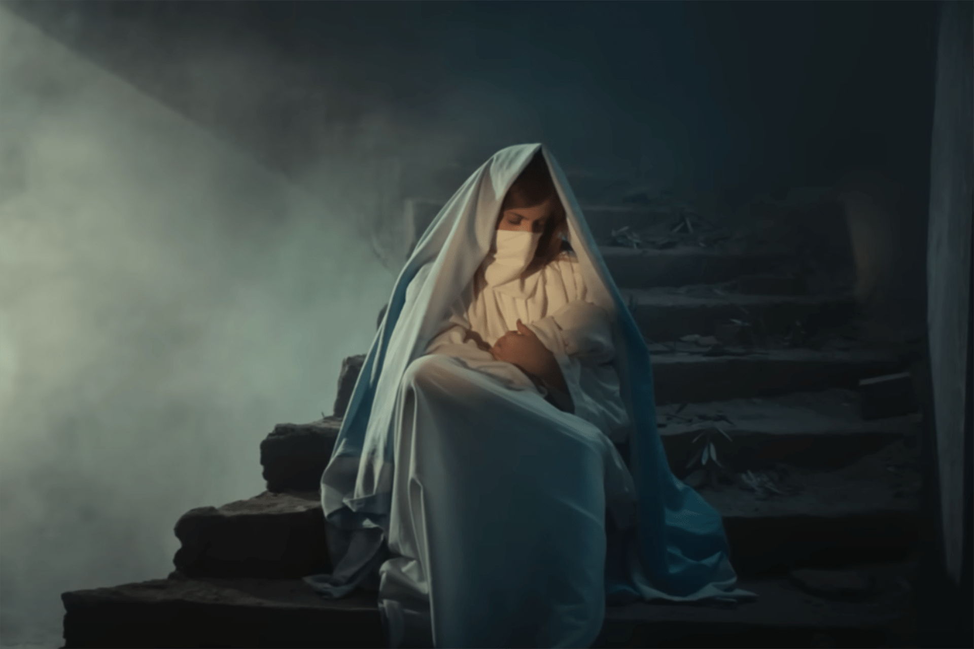 هكذا يتداعى كل واقع مألوف ويتبدل إلى آخر شرس في الحرب فتضم أُمٌّ طفلها محاولة النجاة به، في تجسيد لـ”العذراء وعيسى”. يحكي رضوان خلطه بين العملين في ذلك المشهد، سالبا شكلا من العمل المنحوت وتصميم المرسوم، لما فيهما من رمزية مساع السيدة مريم للهروب بعيسى -عليه السلام- وهو في المهد من المذابح التي كان يقيمها الرومان على الأطفال، إذ يؤمن رضوان بمصير الأطفال الفلسطينيين والرومانيين المتشابك بالرغم من تعاقب الأزمنة، ولا سيما أن اليهود هم من سلموا المسيح للرومان.