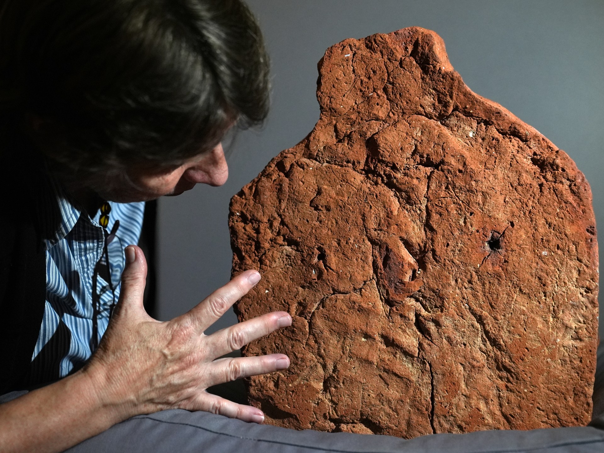 وقد اكتشفت أمينة المتحف، هيلين سترودويك، بصمة اليد خلال معاينتها القطعة الأثرية.