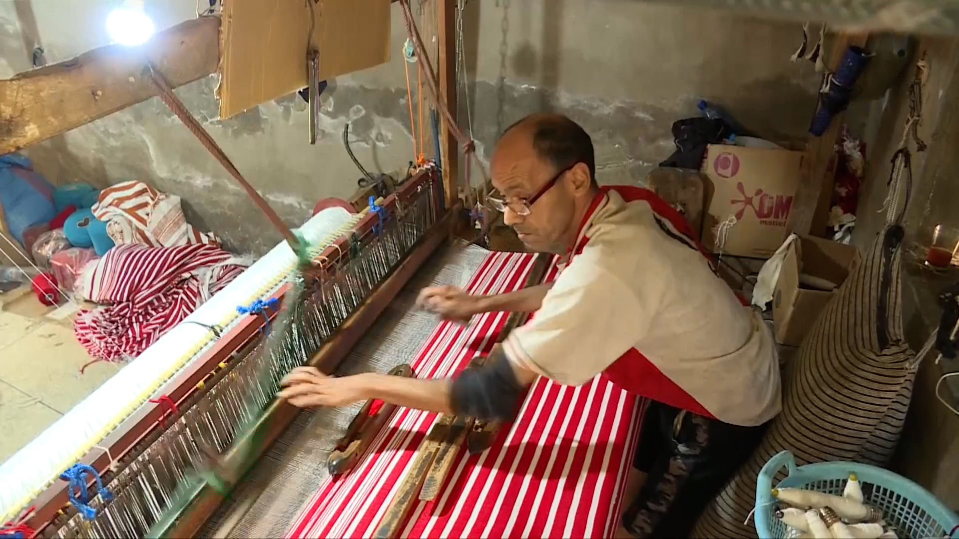 داخل ورشة “الدرازة”، ينهمك بعض العمال في عملية الحياكة بتناغم يجمع مستويات من الأجيال المختلفة، بين شاب يعد الخيوط ومسن بلغ من العمر عتيا يعمل على نسج الجلابيب.
