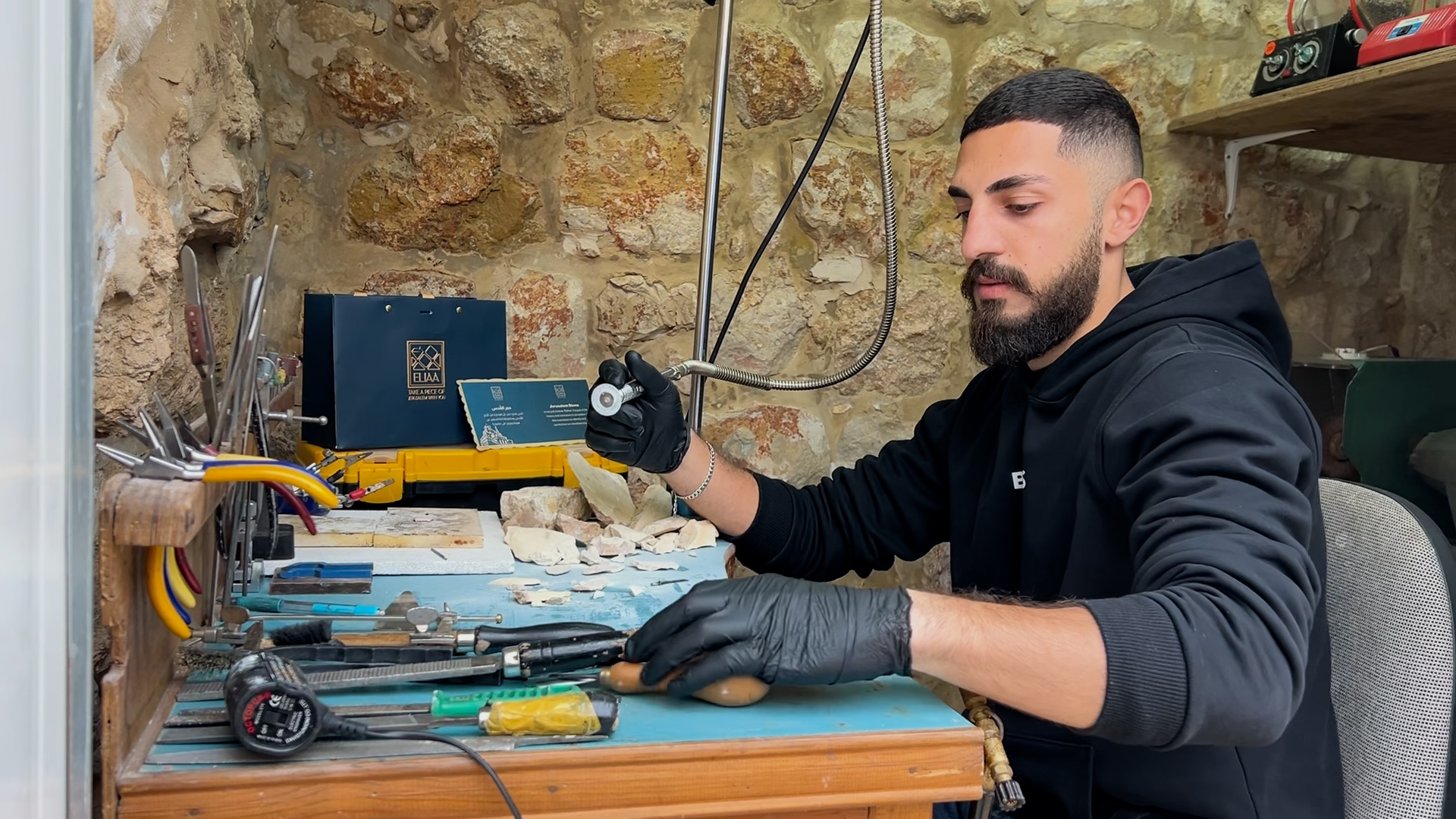 منذ سنوات تولدت لدى الشاب المقدسي إبراهيم الحج خليل، فكرة تحويل الحجارة العتيقة المتساقطة من مباني القدس المحتلة إلى حُلي، مستعينا بمهارته في النحت التي تعلمها من والده وشقيقه في مشغل تملكه العائلة.
