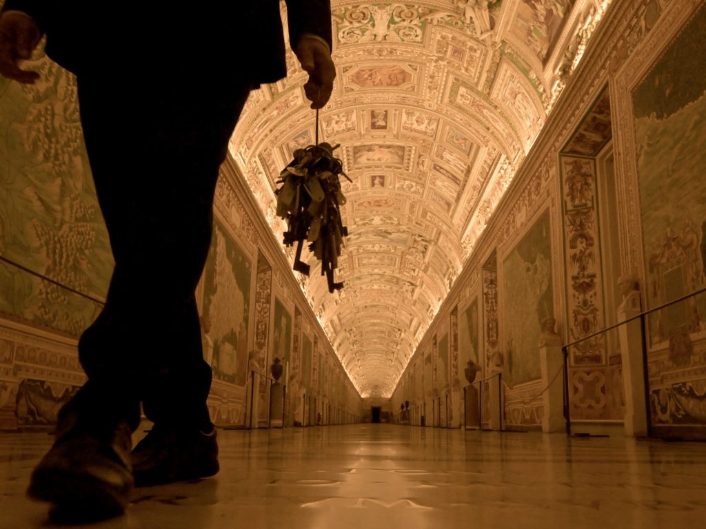 يفتح جياني كريا ليلا الباب الرئيسي لمجمّع متاحف الفاتيكان حاملاً بيده مجموعة مفاتيح ضخمة، ثم يكمل جولته ليفتح أبواب صالات العرض التي تُعد من الأكثر استقطابا للزوار في العالم.
