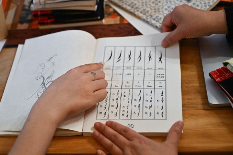 داخل مشغل هادئ في مقاطعة هونان بوسط الصين تمسك إحدى المعلمات بفرشاة حبر، وتخط بلطف حروفا أنيقة وهامسة.