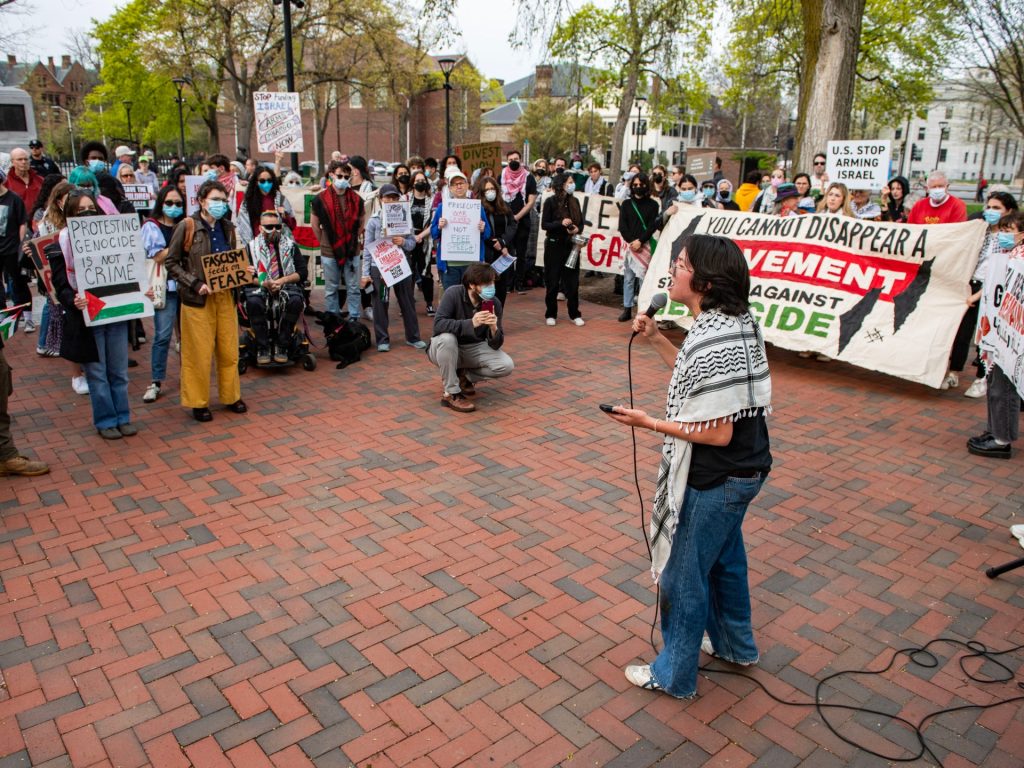 (FILES) Demonstrators with signs stand around the John Harvard Statue in Harvard Yard following a rally against President Donald Trump’s attacks on Harvard University at Harvard University in Cambridge, Massachusetts on April 17, 2025.