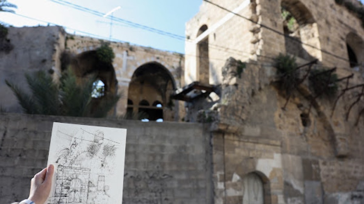 الفنانة ولاء شبلاق أثناء توثيق معلم أثري في البلدة القديمة بغزة، ضمن مشروعها "مسار ما تبقى لنا"