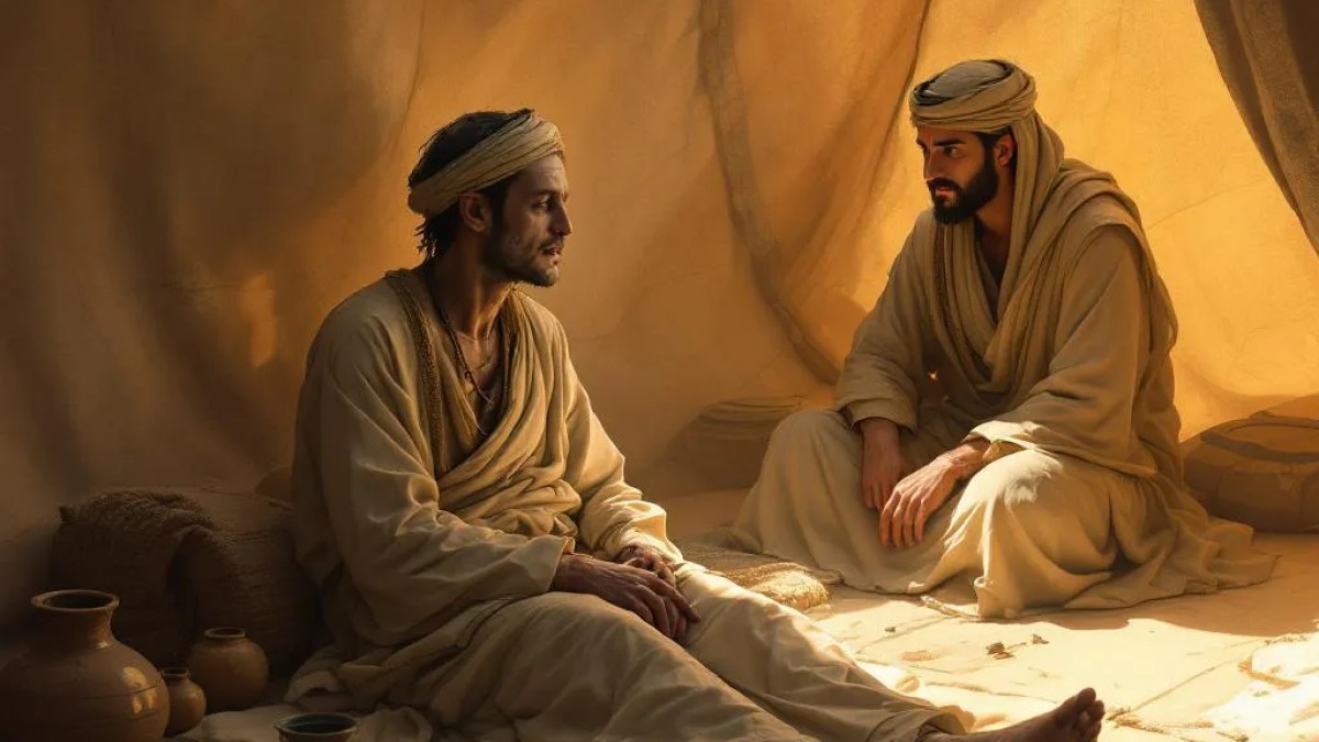 "A poetic, symbolic scene of an extremely ill man in a traditional Arabic interior. He appears thin, pale, and trembling, lying on a simple bed. His sunken eyes stare into space, lips dry, chest heaving with difficulty. A stained cloth in his hand hints at internal bleeding. His body is weak, and his spirit seems to be fading. Moonlight filters softly through a carved window, casting long shadows across the room. No text or writing anywhere in the image. The atmosphere is heavy, quiet, and full of emotion—evoking the loneliness, weakness, and existential fragility of illness. Use soft desert-inspired tones, deep shadows, and a timeless, painterly style."
