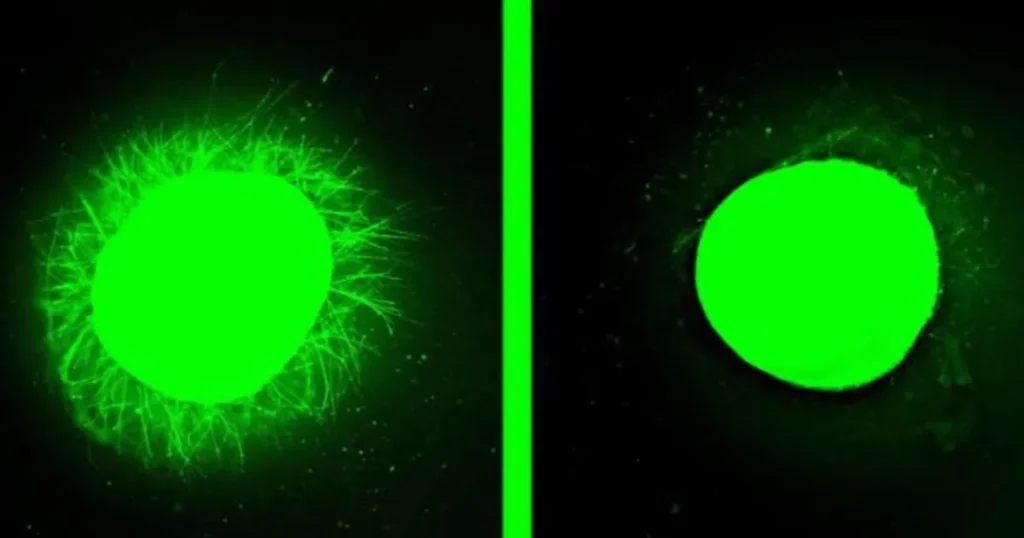 أظهرت النتائج المجهرية زيادة واضحة في نمو الامتدادات العصبية في العضيات المصابة التي عولجت بالعلاج التجريبي، مقارنة بالعينات غير المعالجة. كانت الامتدادات العصبية في العينات المعالجة بالجزيئات الأكثر حركة أطول وأكثر كثافة، مما يعكس فعالية أعلى في تحفيز النمو العصبي.