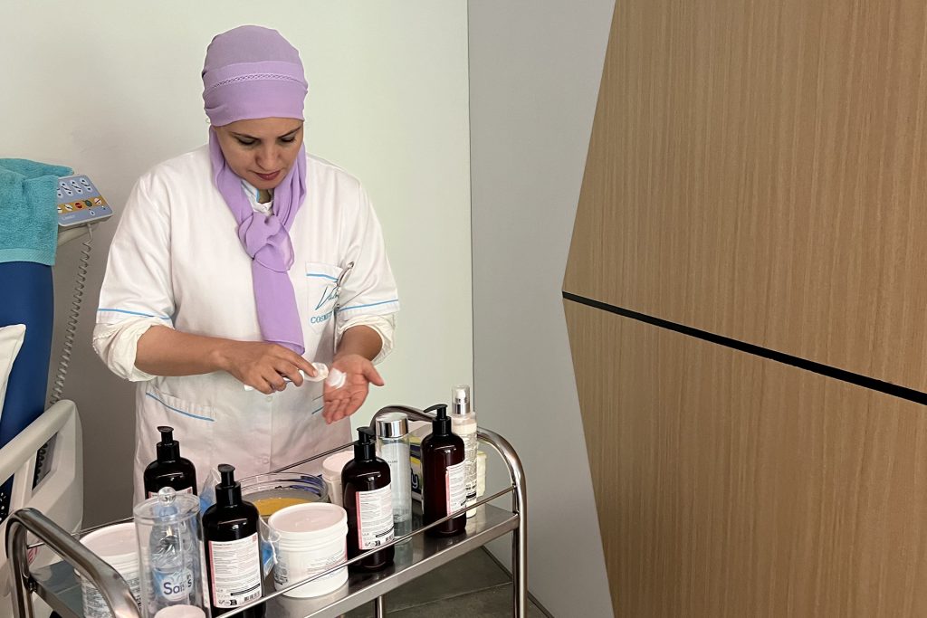 الرباط – في كل يوم جمعة، تقصد المغربية نجاة بنعمارة قاعة علاج السرطان بمصحة 16 نوفمبر/تشرين الثاني بالرباط، ترتدي وزرة بيضاء، وتدفع طاولة ممتلئة بمنتجات وكريمات التجميل. تقف بابتسامتها الهادئة إلى جوار مريضة سرطان تتلقى حصة العلاج الكيميائي، لتمنحها جلسة عناية بالوجه وتدليك اليدين، لكنها في العمق تهديها شيئا أثمن بكثير: الأمل.