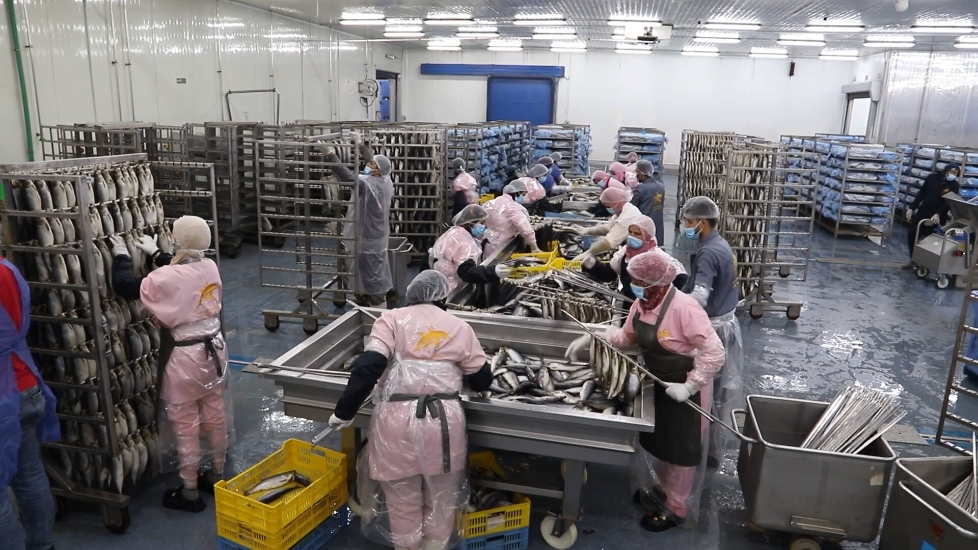 وفي المرحلة الثالثة، يدفع العاملون طاولات الأسماك داخل غرف كهربائية أشبه بأفران بدرجة حرارة معنية. ولاحقا، يفتح آخرون أبواب الأفران ليخرج بخار كثيف جراء عملية التدخين، وتظهر الأسماك بلون ذهبي، قبل أن يبدأ تجميدها لساعات.