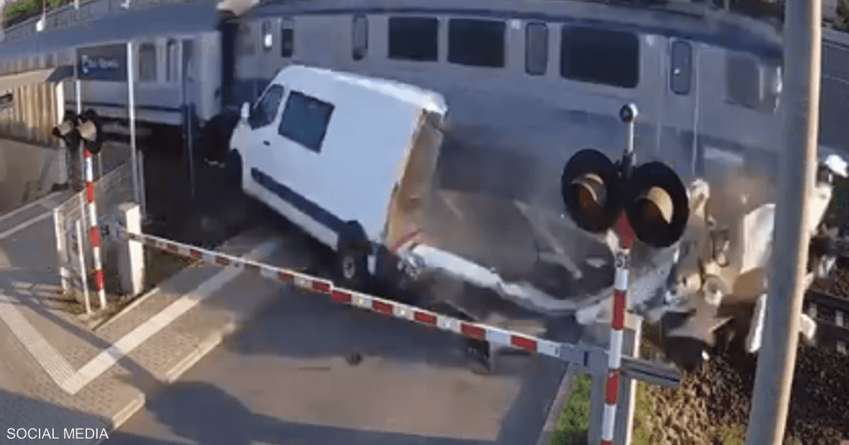 وأظهر مقطع فيديو منتشر على مواقع التواصل الاجتماعي، لقطات صادمة سجلتها كاميرات المراقبة، لحظة اقتراب السيارة من المعبر في محاولة لتجاوز الحاجز قبل إغلاقه. إلا أن الحواجز هبطت سريعا، لتحاصر السيارة على القضبان في الوقت الذي كان القطار يقترب بسرعة عالية.