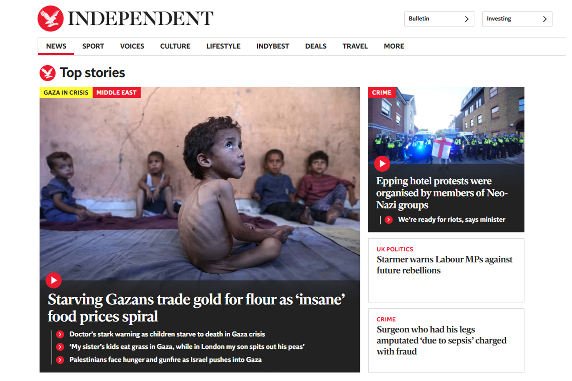 صحيفة إندبندنت البريطانية التي تُعرف بتوجهها السياسي الليبرالي التقدمي، وتميل إلى دعم قضايا مثل حقوق الإنسان، وحماية البيئة، والتعاون الأوروبي، وحرية التعبير، والتي غالبا ما تتبنى مواقف قريبة من الوسط واليسار، فقد أبرزت المزيد من الاهتمام بما يجري في غزة.