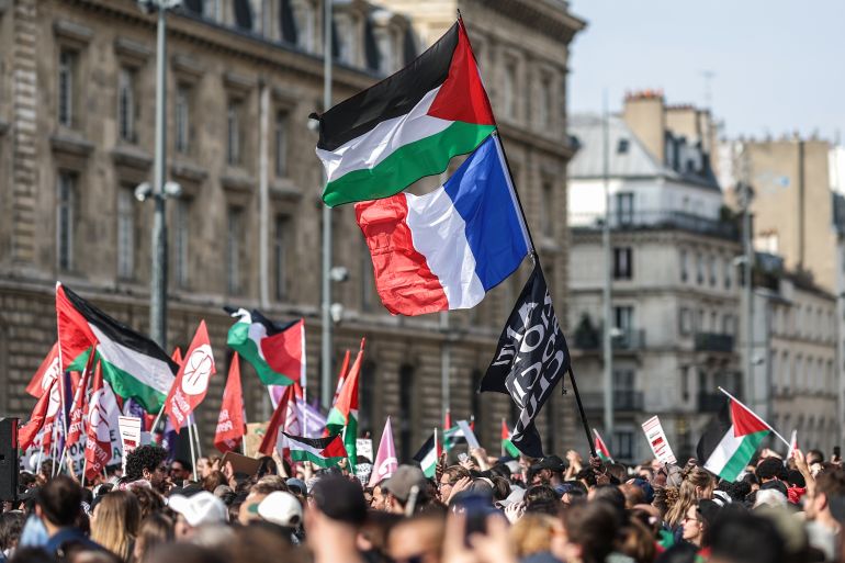 epa12166753 Demonstrators wave Palestinian and French flags during a solidarity rally for Gaza and Palestine at the Place de la Republique in Paris, France, 09 June 2025. La France Insoumise organizes a protest against Israel’s interception of the Freedom Flotilla and the arrest of 12 humanitarians, including French MEP Rima Hassan and climate activist Greta Thunberg. The FFC stated its Gaza-bound Madleen ship, carrying a small shipment of humanitarian aid, was forcibly intercepted by the Israeli military in international waters on 09 June 2025. EPA-EFE/MOHAMMED BADRA