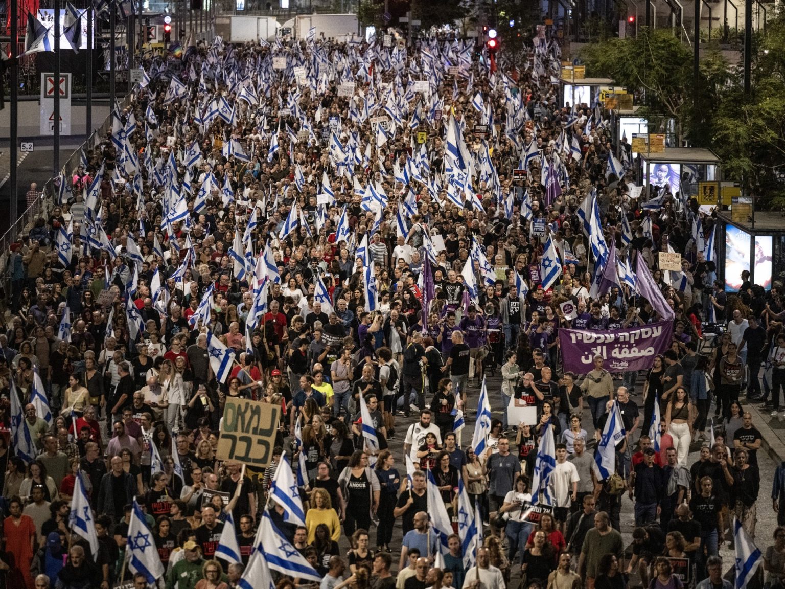 تظاهر آلاف الإسرائيليين، اليوم السبت، في نحو 70 موقعا للمطالبة بالإفراج عن المحتجزين في قطاع غزة وإجراء انتخابات مبكرة، في حين اتهمت المعارضة الإسرائيلية رئيس الوزراء بنيامين نتنياهو بمحاولة إفشال صفقة تبادل الأسرى مع حركة حماس.