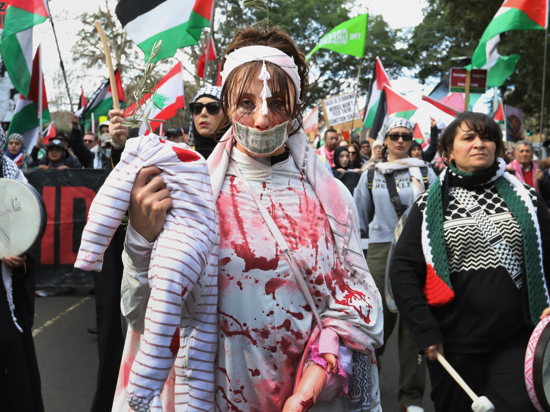 قوات الخيالة الأسترالية تتابع عن كثب مسيرة احتجاجية انطلقت في مدينة سيدني حيث تجمّع مئات المتظاهرين بالقرب من جسر هاربور تنديدا بالهجمات الإسرائيلية على غزة (الفرنسية)