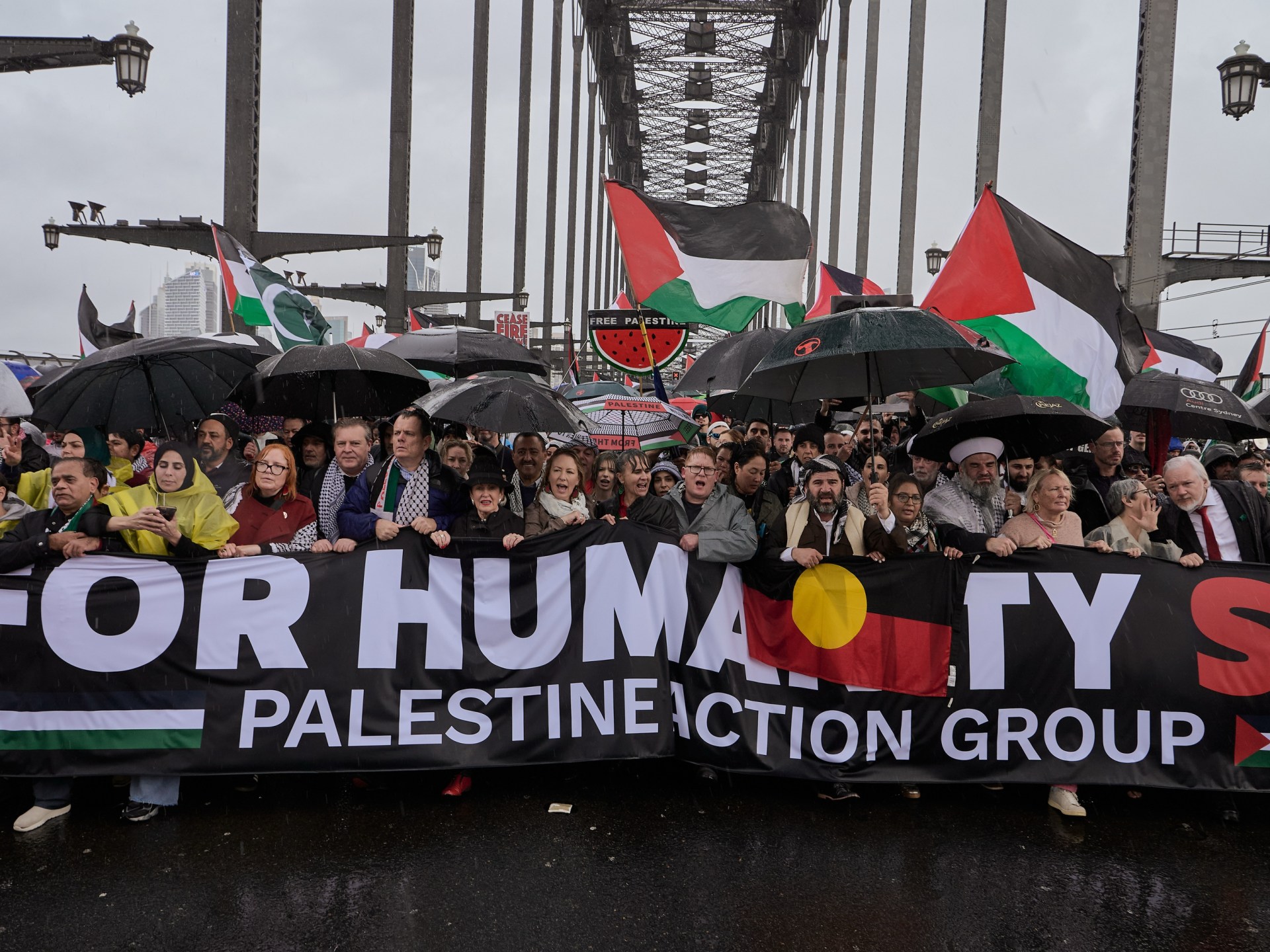 خرج عشرات آلاف المتظاهرين المؤيدين للفلسطينيين، وفيهم مؤسس موقع ويكيليكس جوليان أسانج، اليوم الأحد في مسيرة أغلقوا خلالها جسر ميناء سيدني الشهير في أستراليا.