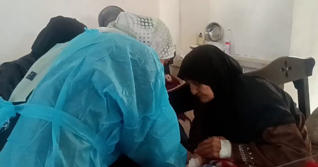هبة أبو حصيرة تحاول التعافي من فاجعة إعدام أسرتها من خلال التطوع ممرضة لخدمة الجرحى والمرضى (الجزيرة)