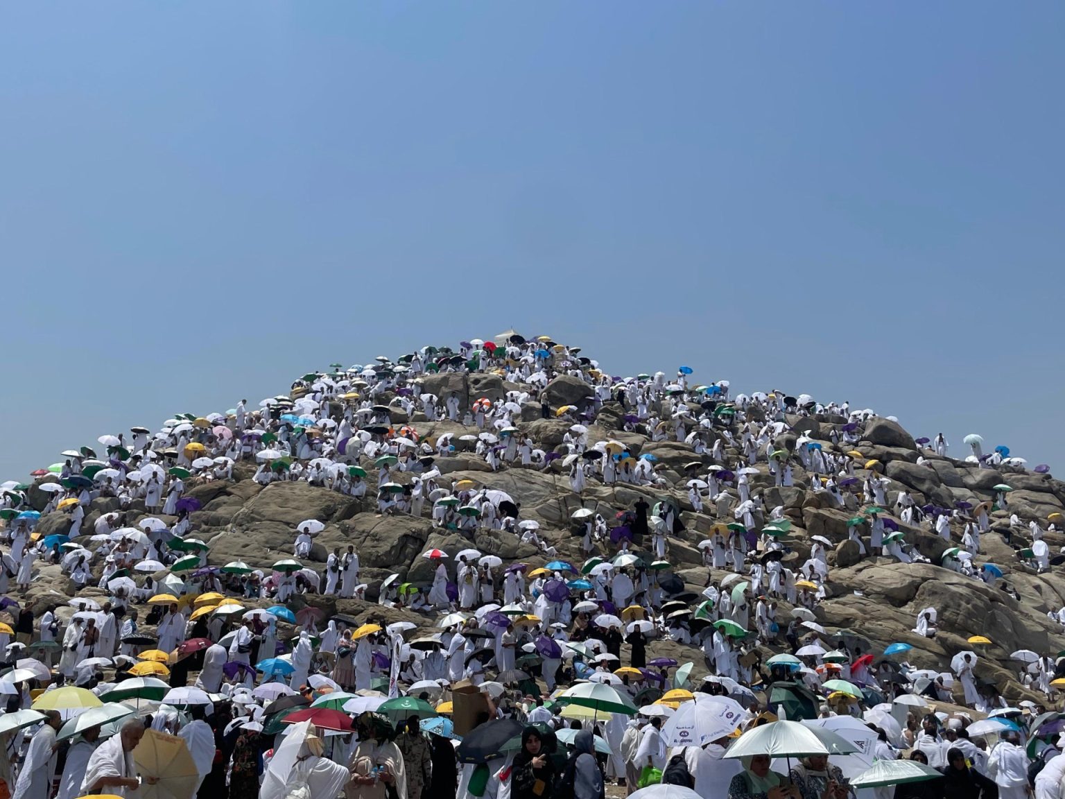 ونقلت قناة الإخبارية السعودية الرسمية مشاهد جوية عبر حسابها بمنصة إكس، تظهر اكتساء جبل الرحمة باللون الأبيض، حيث غص بضيوف الرحمن وقد ارتفعت أيديهم للسماء ولهجت ألسنتهم بالدعاء، تأسيا برسول الإسلام محمد صلى الله عليه وسلم الذي وقف عليه وألقى منه خطبة الوداع.