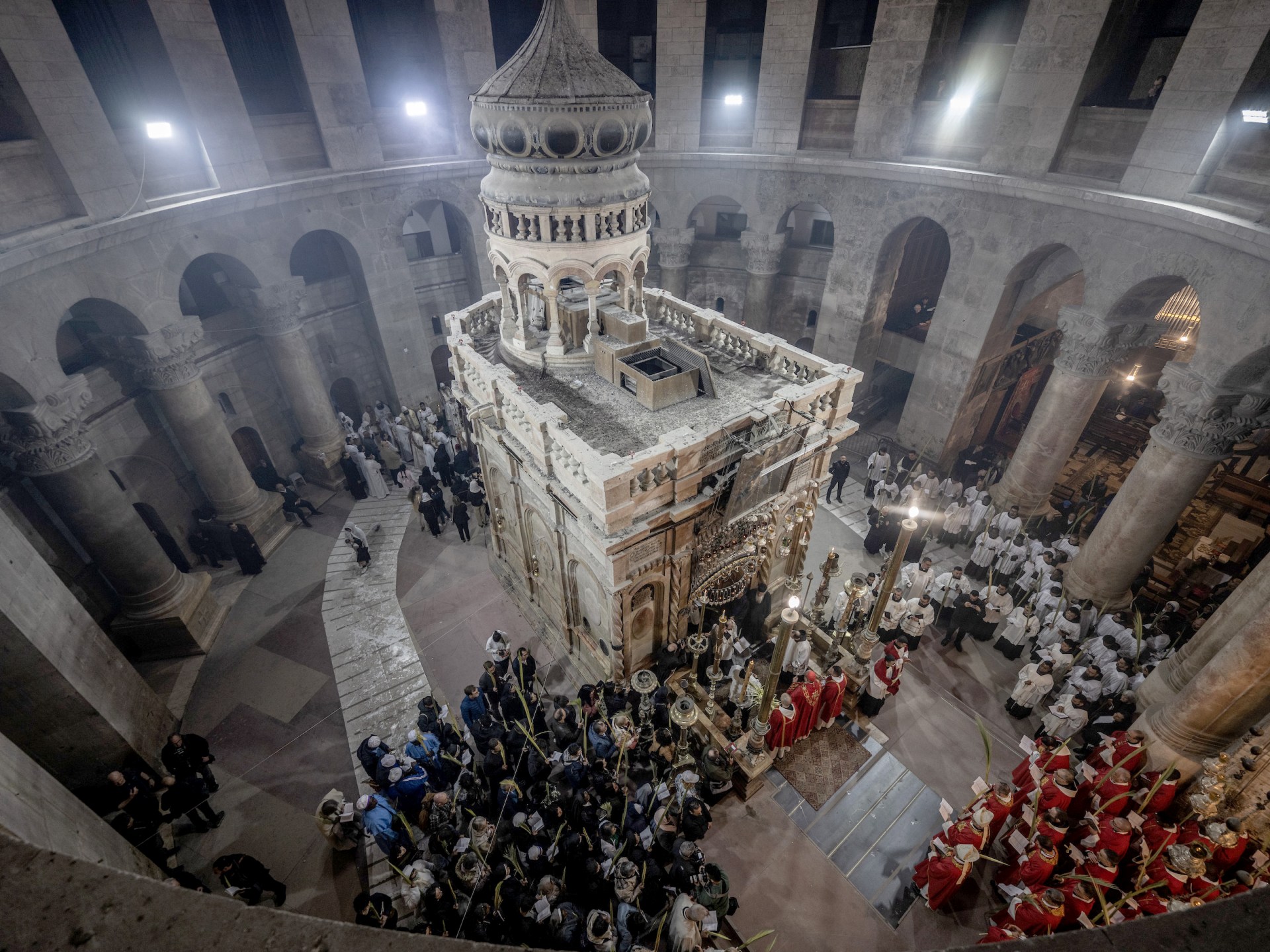 وشارك في القداس الذي أقيم أمام “القبر المقدس” لفيف من الأساقفة والكهنة، بحضور حشد من الرهبان، والراهبات وعدد محدود من المصلين، غالبيتهم من مدينة القدس وأراضي الـ48، بعد أن حرم الاحتلال الإسرائيلي الآلاف من المسيحيين من محافظات الضفة الغربية من الوصول إلى المدينة المقدسة.