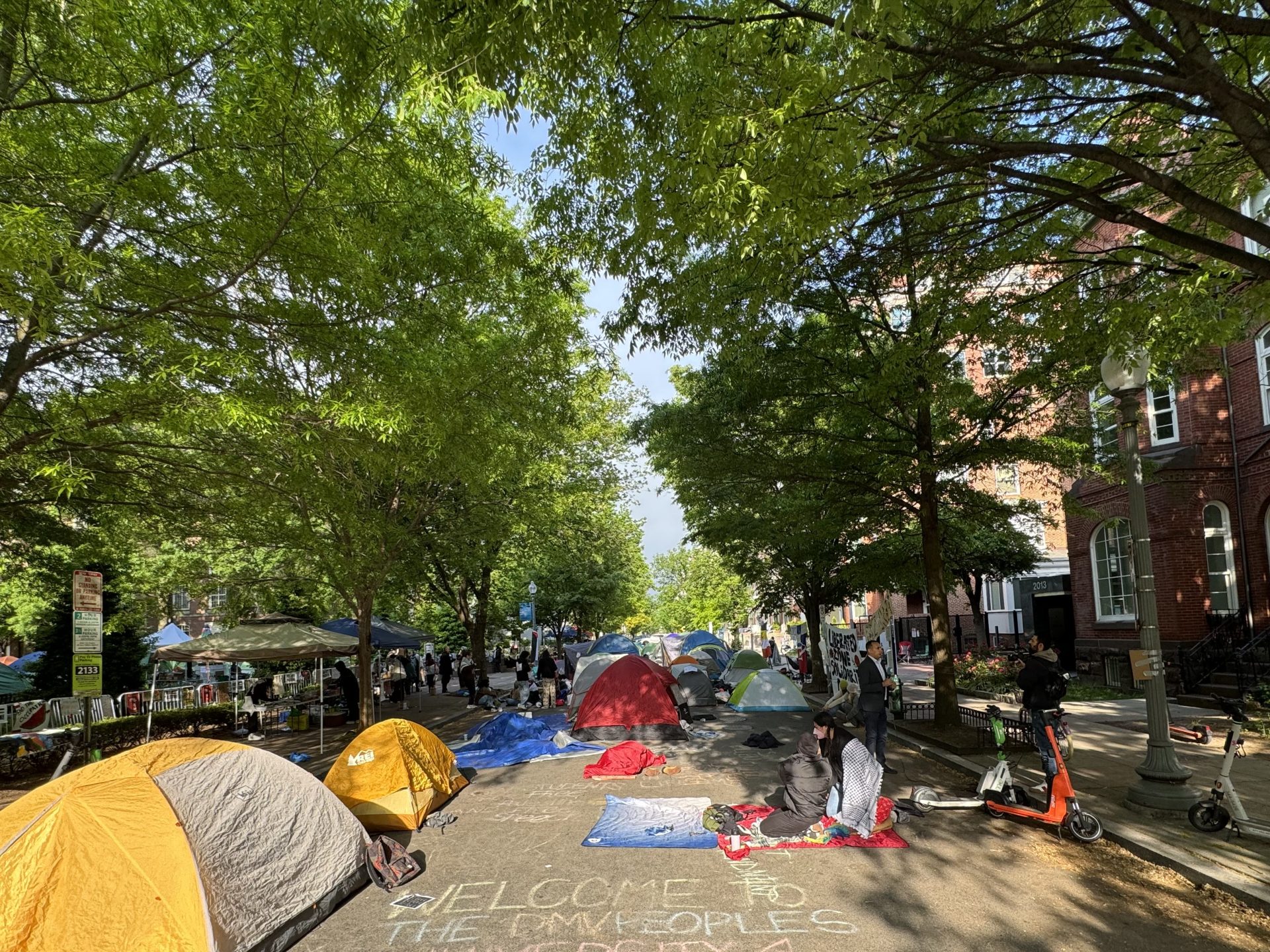 ويجذب مقر الاعتصام الكثير من المحتجين على العدوان الإسرائيلي من منطقة واشنطن الكبرى وضواحيها في ولايتي فيرجينيا وميريلاند. وتحتل الخيام المساحة الخضراء في ساحة الجامعة، وتغطي الكتابات الطباشيرية الأرصفة.