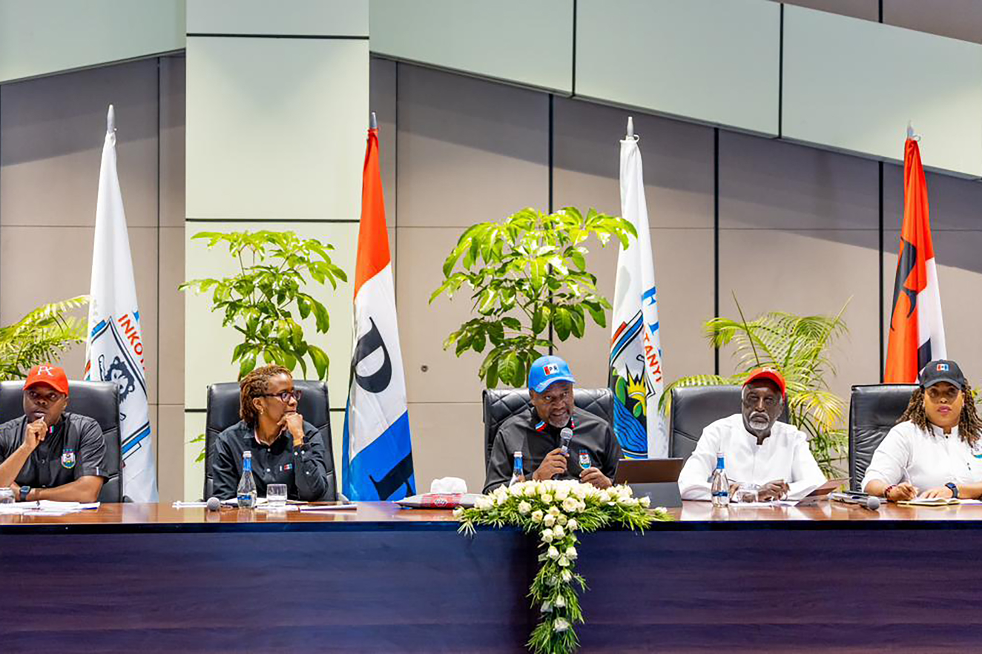 الأمين العام للجبهة الوطنية الرواندية الحزب الحاكم ويلارس غاساماغيرا خلال المؤتمر الصحفي للحزب أمس (كيغالي توداي)