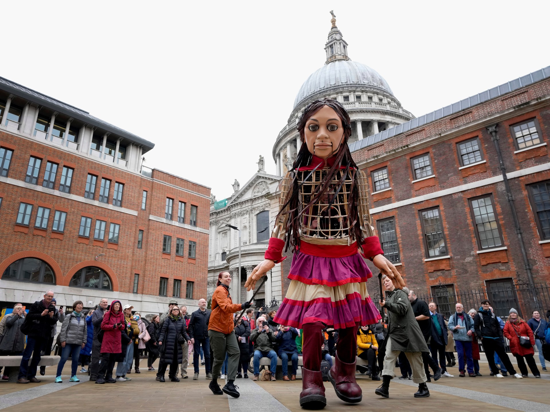 و”أمل الصغيرة” دمية عملاقة يحركها فريق من محركي الدمى وتمثل طفلة سورية لاجئة تقوم برحلة طويلة بحثا عن أمها التي خرجت لجلب طعام ولم تعد.