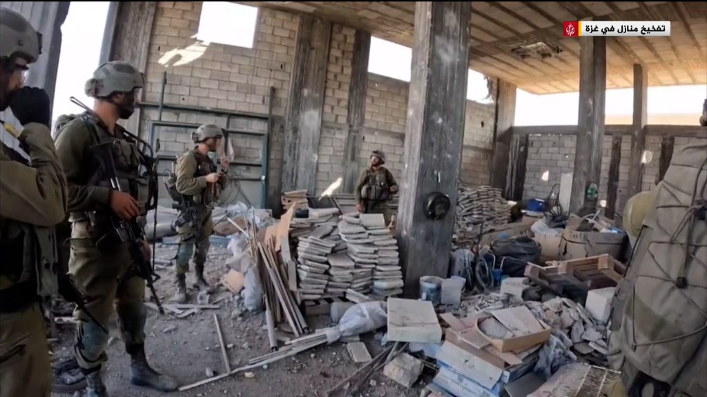 نشرت كتائب القسام -الجناح العسكري لحركة المقاومة الإسلامية (حماس)- صورا تظهر قيام القوة الإسرائيلية بتفخيخ منزلين في مخيم المغازي وسط قطاع غزة، قبل استهدافهما من جانب المقاومة.