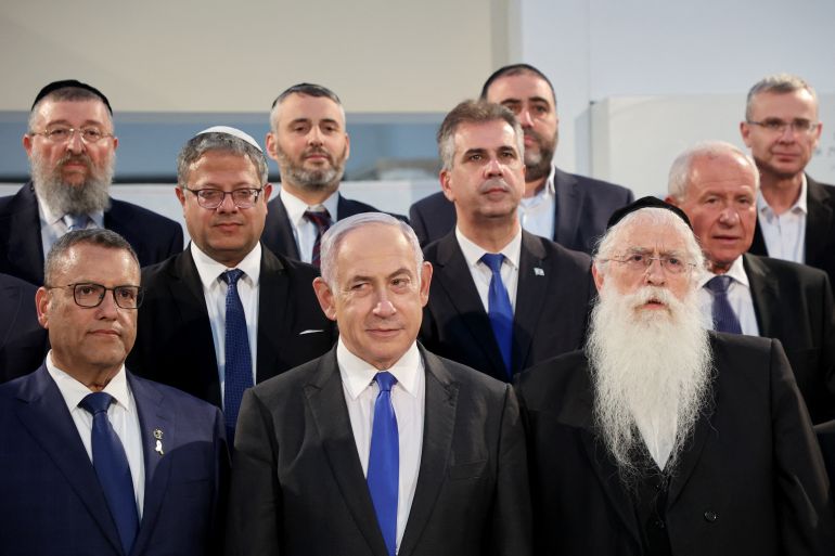 نتنياهو (وسط بالأسفل) أحاط نفسه بشخصيات شعبوية وأطلق خطابا يمينيا متطرفا ضمن حسابات استمرار زعامته (الفرنسية)