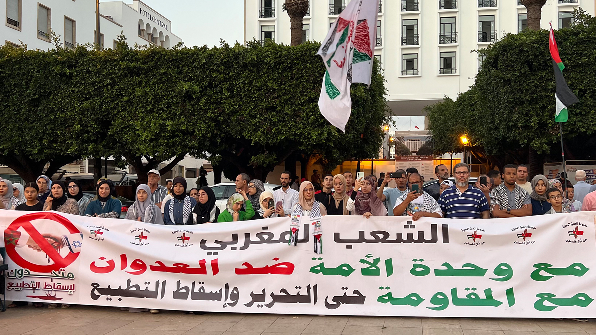 وشارك في الاعتصام سياسيون ونقابيون وحقوقيون ومواطنون، ورفعوا شعارات تدعو إلى إنهاء الحرب في غزة وإلى استمرار مقاطعة البضائع التي تدعم الاحتلال وتطالب بإسقاط التطبيع. وحملوا أعلام فلسطين والمغرب وصور قبة الصخرة والمسجد الأقصى، ولافتات تدعو لوحدة الأمة وتدعم المقاومة حتى التحرير.