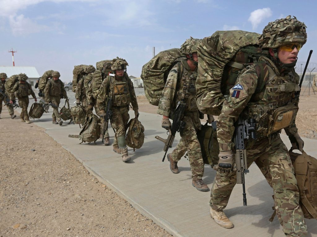 BRIZE NORTON, ENGLAND - AUGUST 28: Members of the British armed forces 16 Air Assault Brigade walk to the air terminal after disembarking a Royal Airforce Voyager aircraft at Brize Norton as they return from helping in operations to evacuate people from Kabul airport in Afghanistan on August 28, 2021 in Brize Norton, England. More than 100,000 people have been safely evacuated through the Kabul airport, according to the U.S., but thousands more are struggling to leave in one of history's biggest airlifts. (Photo by Alastair Grant-WPA Pool/Getty Images)