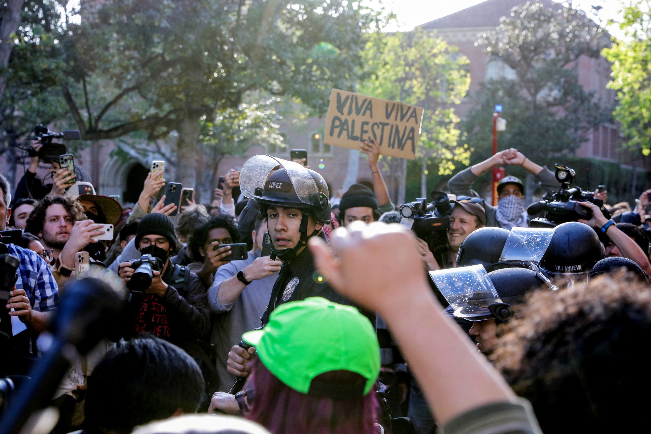 واعتقلت الشرطة مئات المتظاهرين منهم أكثر من 90 من جامعة جنوب كاليفورنيا، الأربعاء.