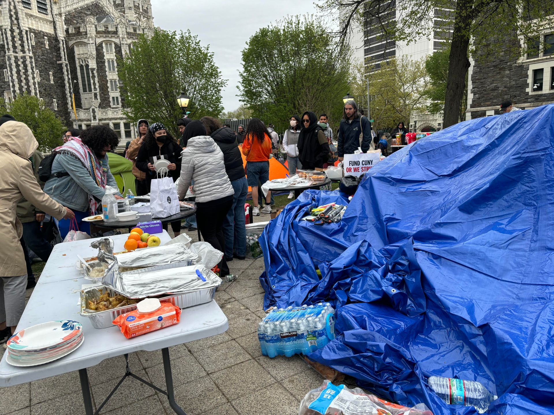 نيويورك- بمجرد دخول مكان الاعتصام في كلية مدينة نيويورك يمكن ملاحظة طاولات مصطفة بجوار بعضها، ممتلئة بأصناف من الأطعمة والمشروبات، كالطعام الصيني، والباكستاني، والعربي، والحلويات، والمشروبات الباردة والساخنة، ويتشابه هذا المشهد مع خدمات منظمة لحراك الطلاب في جامعة كولومبيا، وغيرها من الجامعات الأخرى.