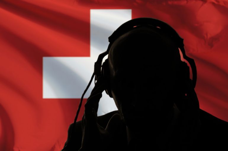 The silhouette of a man with headphones on the background of the flag of Switzerland eavesdropping on a conversation, a secret agent, a military intervention, a coup, an intelligence spy, a diplomat.