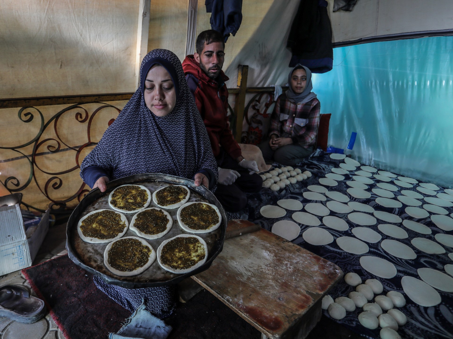 داخل خيمة نزوح بمدينة رفح جنوبي قطاع غزة، تنشغل عائلة الفلسطيني جهاد عاشور بإعداد قطع دائرية الشكل من فطائر البيتزا ومناقيش الزعتر، ضمن مشروع صغير بدأته مؤخرا للحصول على لقمة العيش في ظل تدهور الأوضاع الاقتصادية للسكان، بسبب العدوان الإسرائيلي المتواصل على القطاع منذ 7 أكتوبر/تشرين الأول الماضي.