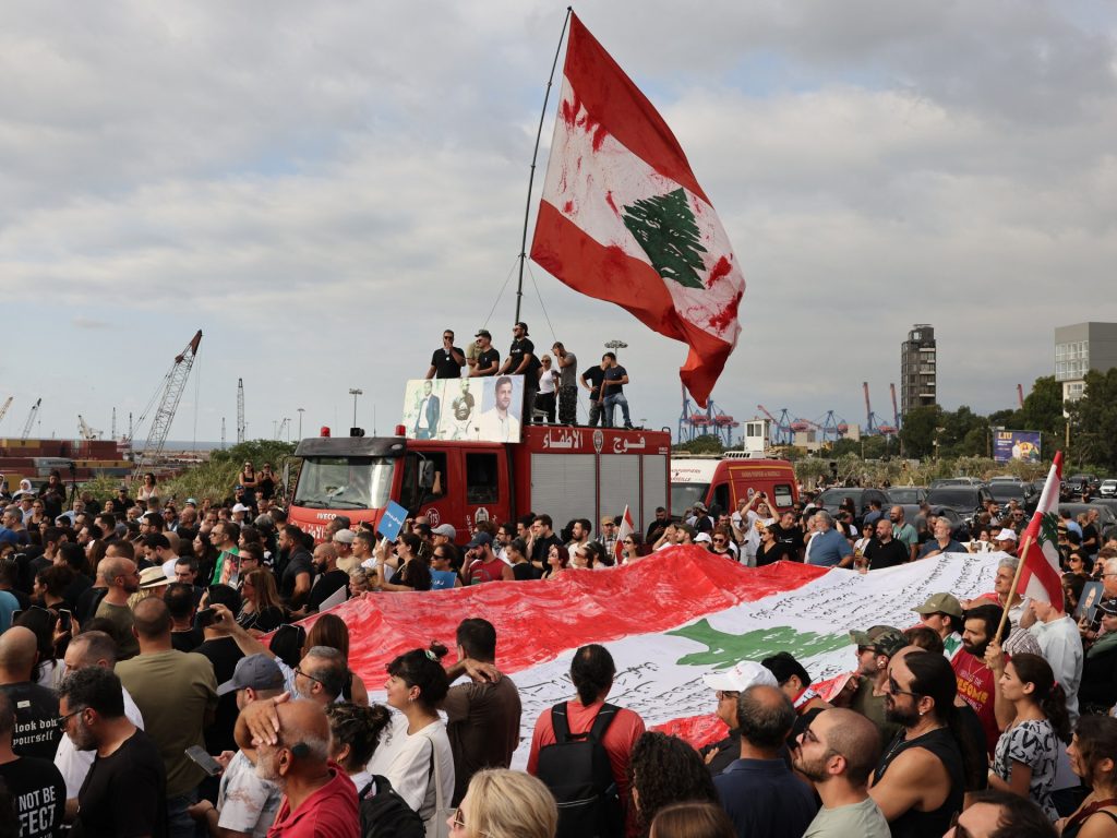 Lebanese demonstrators march during a gathering to honour the victims of the catastrophic port explosion in 2020 and to call for accountability for the blast, in Beirut on August 4, 2025.