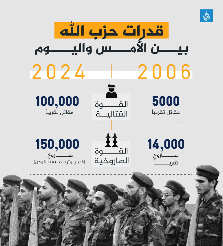 وفي عام 2021، أعلن الأمين العام السابق للحزب حسن نصر الله أن قوة الحزب العسكرية تضم نحو 100 ألف مقاتل مدرّب ومسلّح، مما يعكس حجم التطور الذي حققته قدراته منذ التسلح التقليدي وحتى الأسلحة الدقيقة.