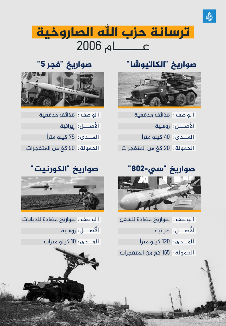 • صواريخ مضادة للسفن: يمتلك حزب الله صواريخ مضادة للسفن استخدمها عام 2016 لاستهداف بارجة إسرائيلية قبالة السواحل اللبنانية.