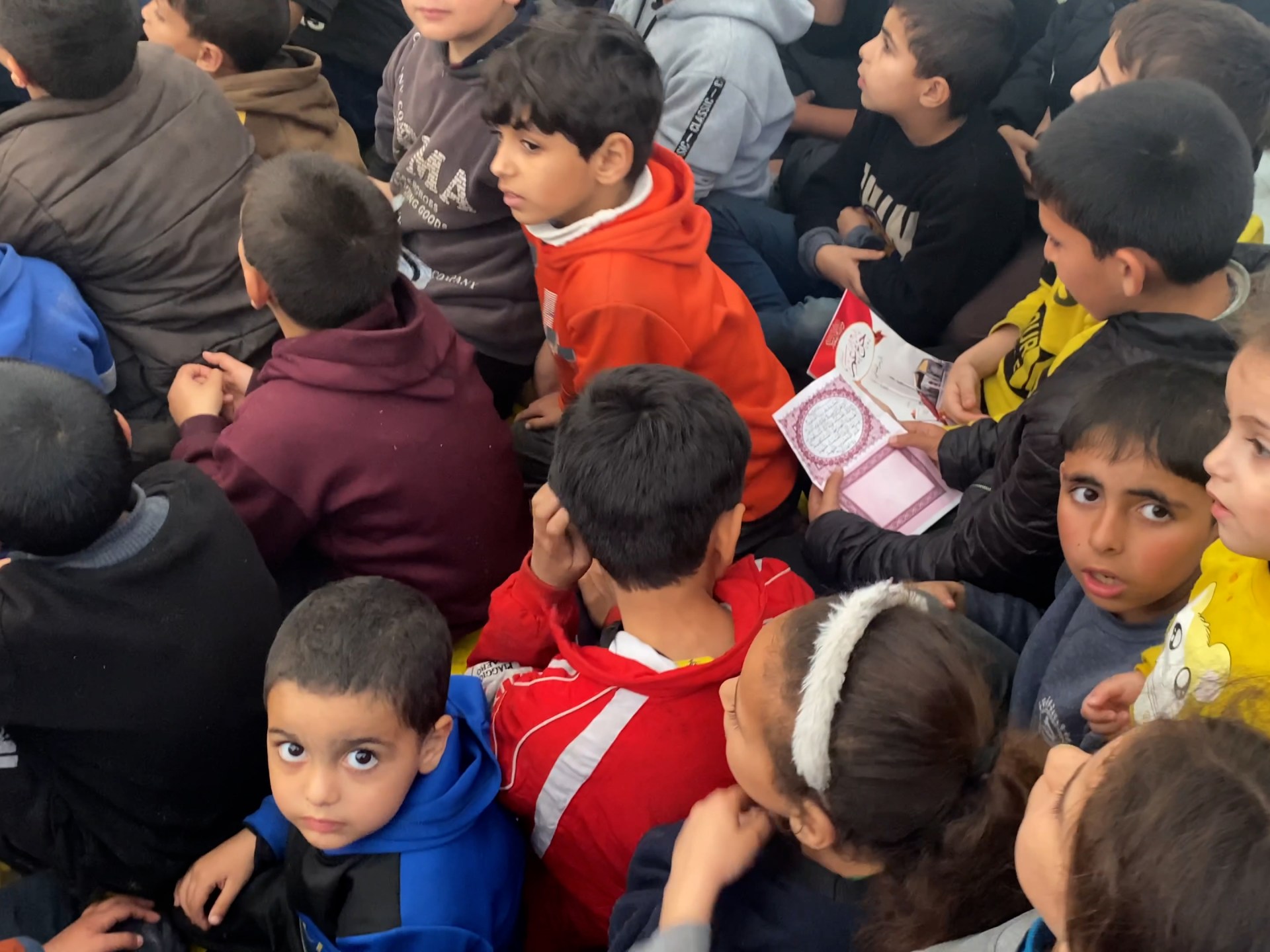 ونشر المصور الفلسطيني أحمد حمدان مشاهد لأطفال نازحين داخل أحد مراكز الإيواء وهم يتلقون القرآن الكريم في إحدى الحلقات المقامة داخل مركز للإيواء شمالي قطاع غزة.