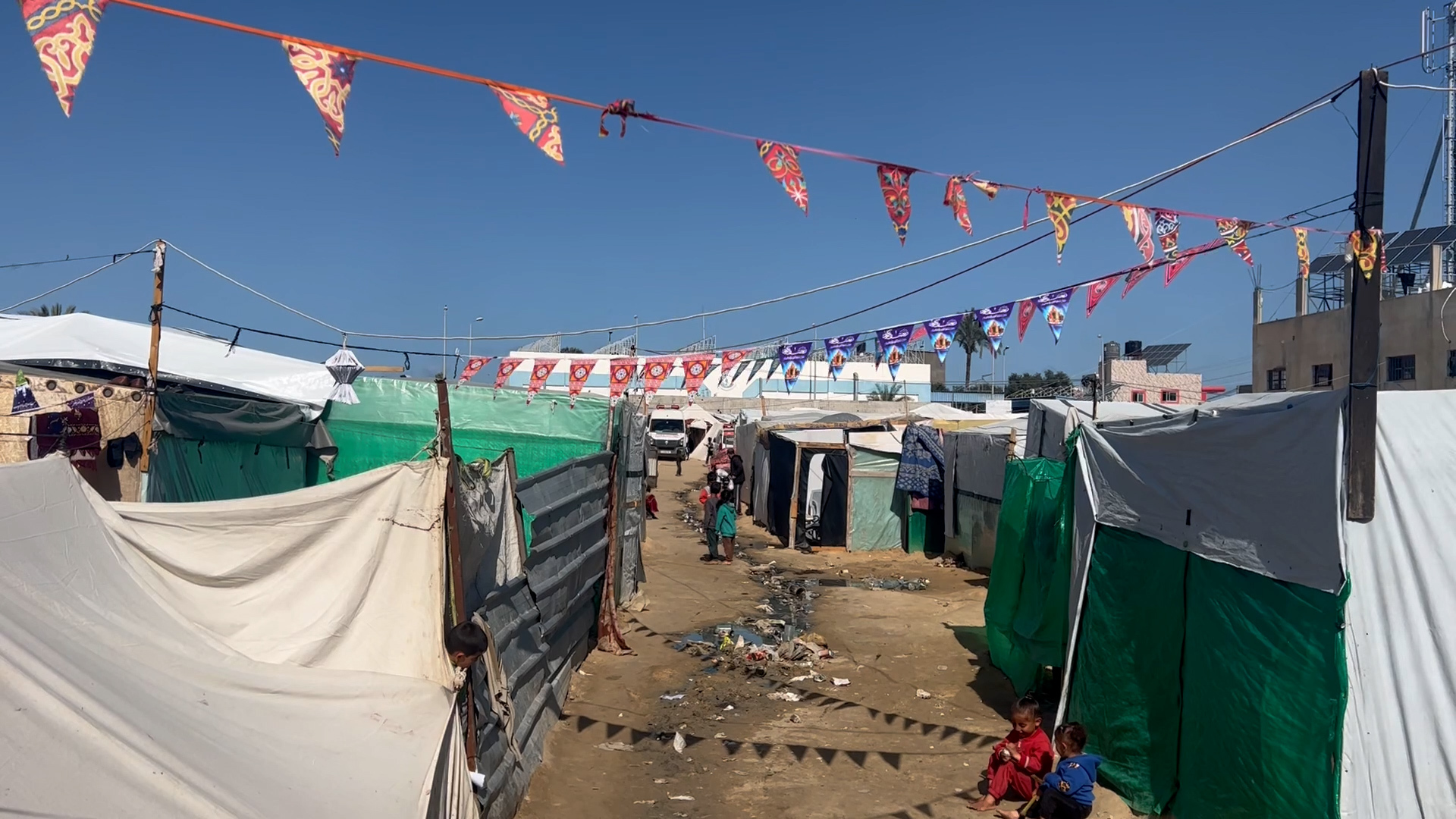 4- عائلة أبو النجا تحاول إيجاد مساحة من البهجة رغم أجواء استمرار عبر تعليق زينة رمضان بين الخيام (خاص بالجزيرة نت)