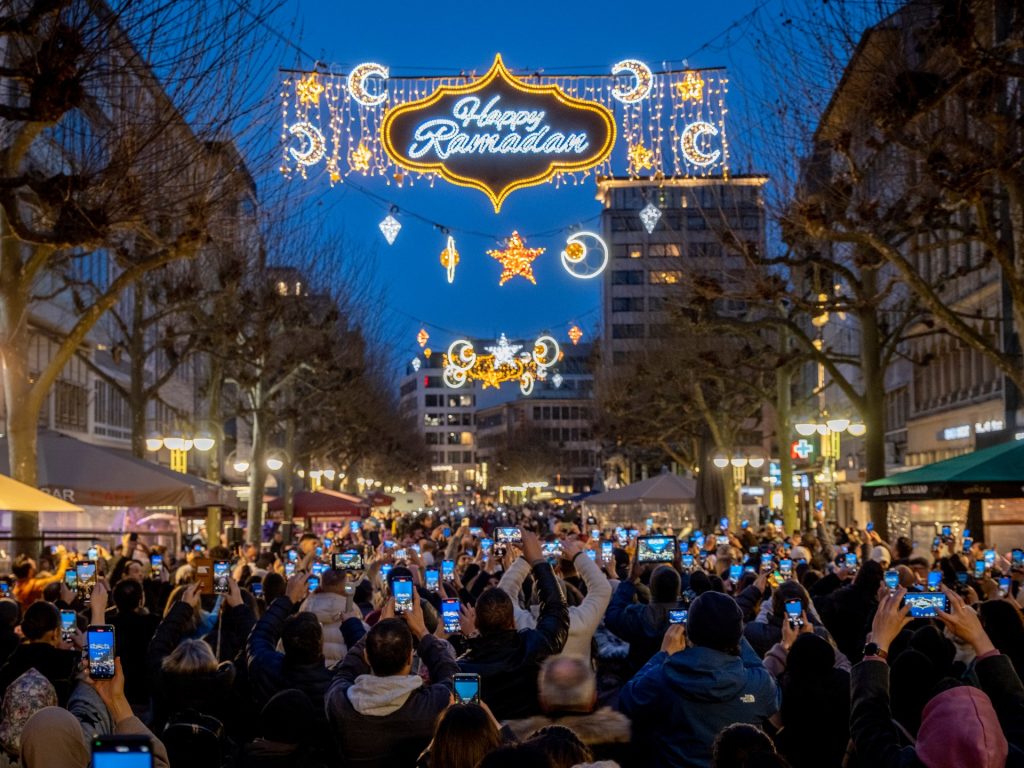 وكشف النقاب رسميا عن لافتة كبيرة تحمل عبارة “رمضان مبارك”، كما تم عرض الأضواء بشكل نجوم وفوانيس، في حفل أقيم مساء وتمت خلاله إضاءة شارع للمشاة في وسط المدينة، الذي يتميز بوجود العديد من المطاعم والمقاهي.