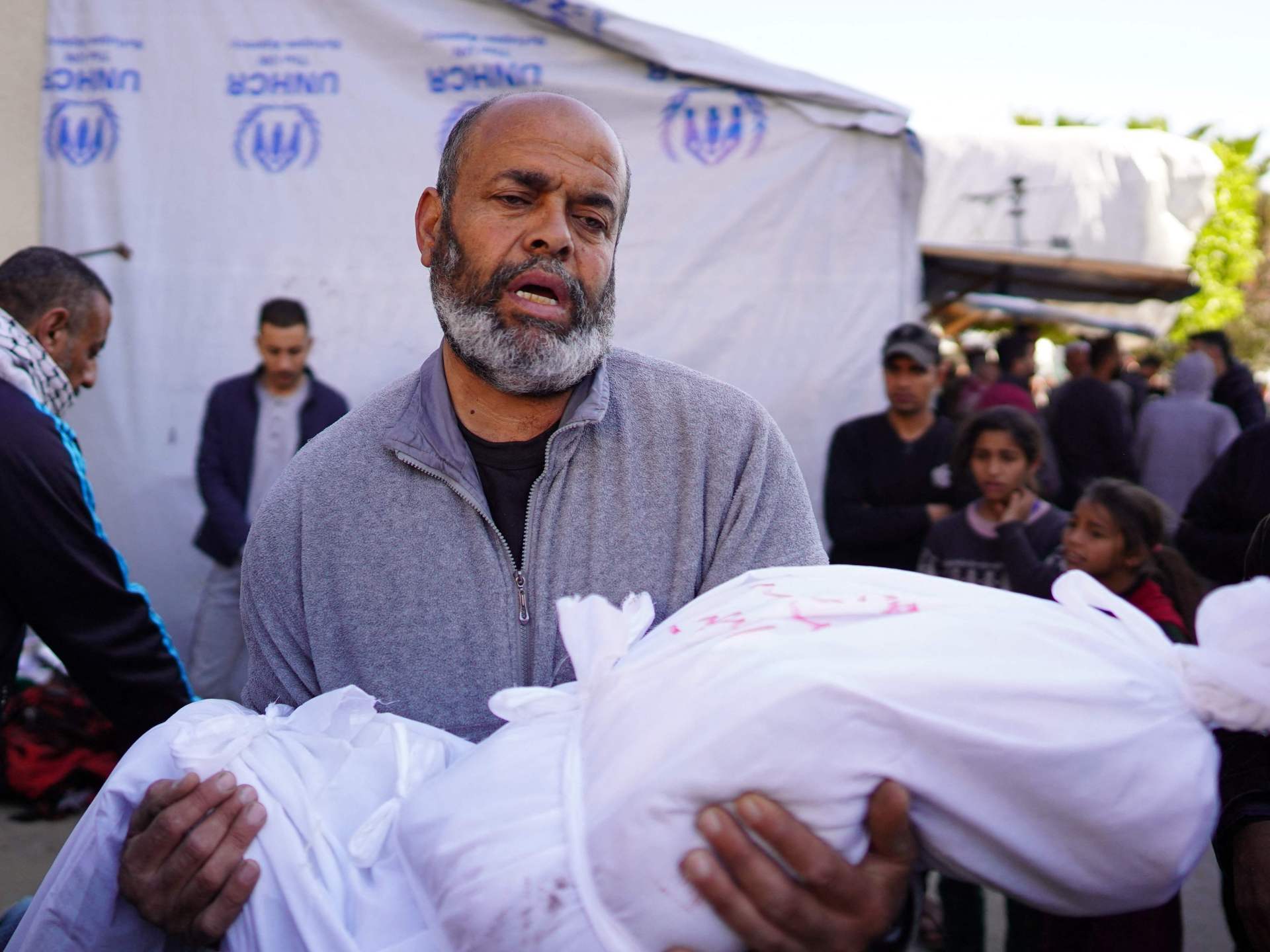 وكان المكتب الإعلامي الحكومي في غزة أعلن استشهاد وجرح مواطنين بينهم 3 صحفيين جراء قصف إسرائيلي -صباح اليوم- استهدف خياما للنازحين والصحفيين في ساحة مستشفى شهداء الأقصى في دير البلح وسط القطاع.