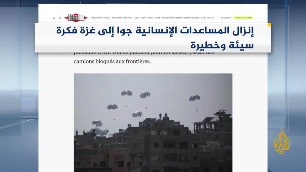 ففي صحيفة “ليبيراسيون” الفرنسية، قال مقال إن إسرائيل سمحت بإسقاط المساعدات جوا إلى غزة بعد ضغوط دولية، لكنه وصف الفكرة بأنها “سيئة وخطيرة وغير مناسبة للقطاع الذي يعاني المجاعة”. وأضاف أن فتح المعابر والسماح بمرور المساعدات العالقة على الحدود هو الحل الأفضل.