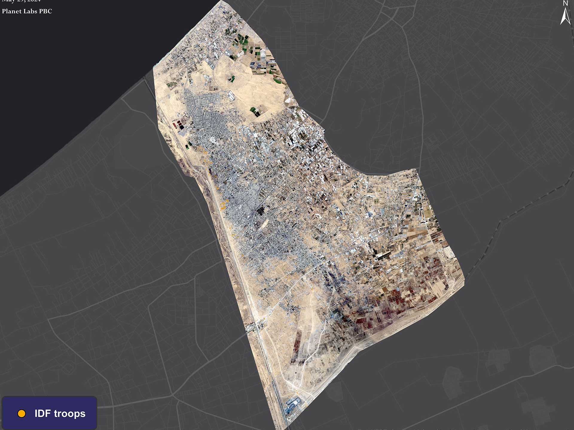 أظهرت صور الأقمار الصناعية الملتقطة في 29 مايو/أيار الماضي توغل وانتشار قوات الاحتلال الإسرائيلي في 22% من مساحة مدينة رفح الفلسطينية، مع تمركز 258 آلية عسكرية في مناطق مختلفة وعلى طول محور فيلادلفيا قرب الحدود المصرية من غرب معبر رفح حتى منطقة تل السلطان.