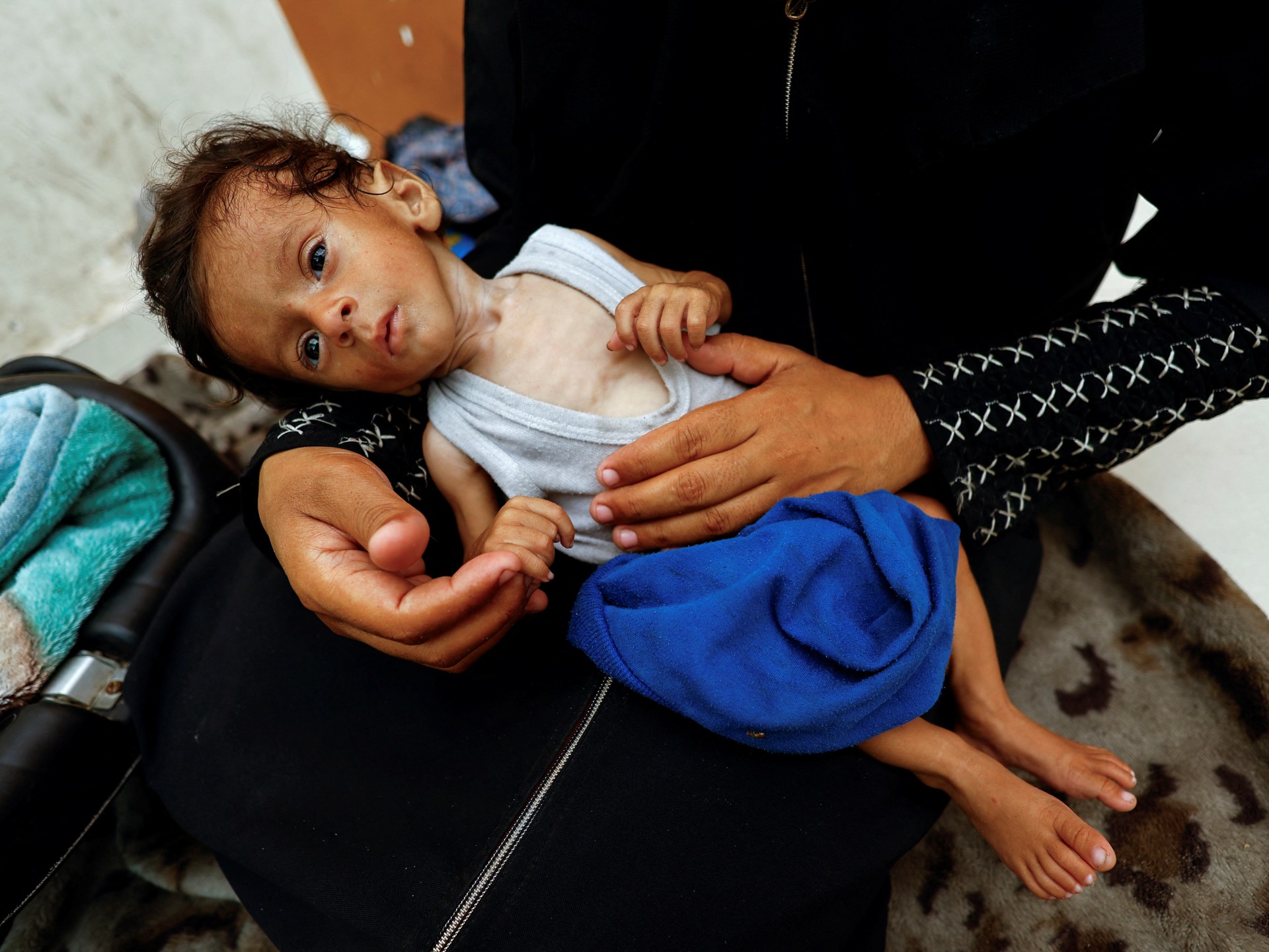 Palestinian mother Amira Muteir holds her five-month-old baby Ammar, whom she says is wasting away from malnutrition, in Gaza City, August 5, 2025. REUTERS/Mahmoud Issa