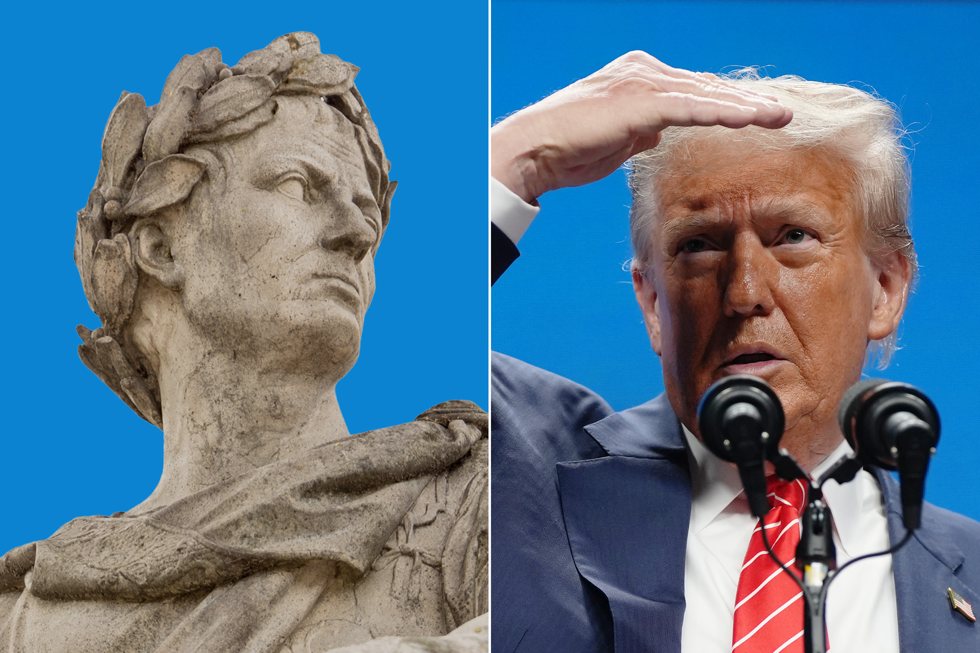 لكن ترامب يُقارن في أغلب الأحيان بيوليوس قيصر الذي قاد جنوده في عام 49 قبل الميلاد عبر نهر الروبيكون، وهو النهر الذي كان يمثل الحدود بين مقاطعة سيسالبين غال في شمال إيطاليا، والمنطقة التي تسيطر عليها روما مباشرة.