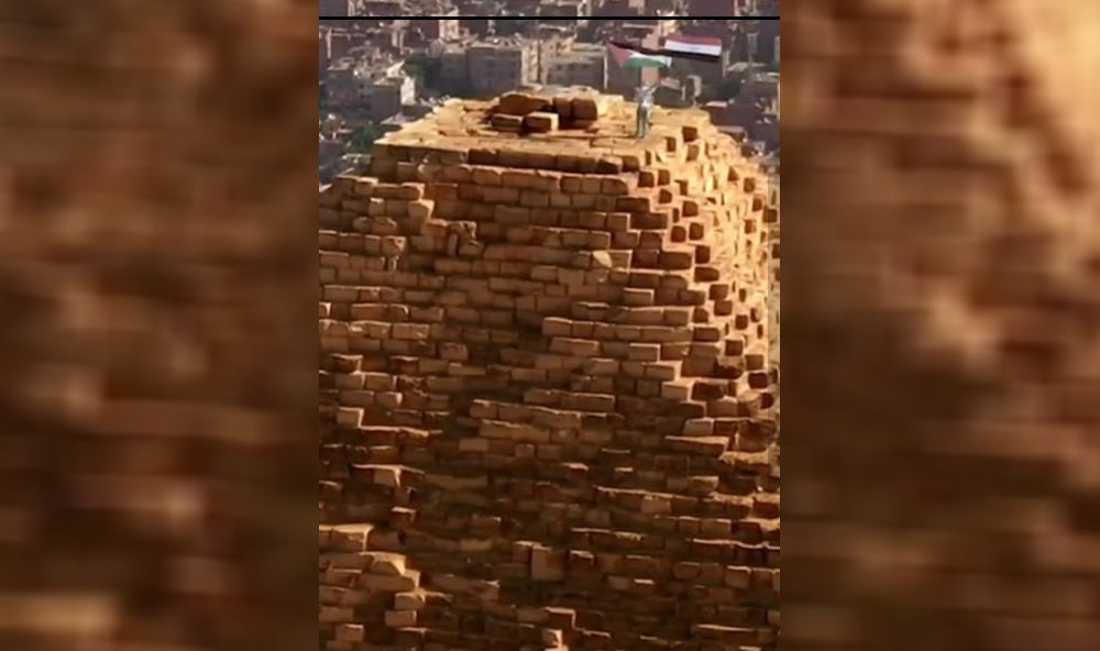يصوّر الفيديو رجلا يمشي على الهرم الأكبر في الجيزة وهو يرفع العلمين الفلسطيني والمصري. وعلق مشاركو الفيديو بالقول “ناشط يرفع العلم الفلسطيني أعلى قمة هرم خوفو…”.