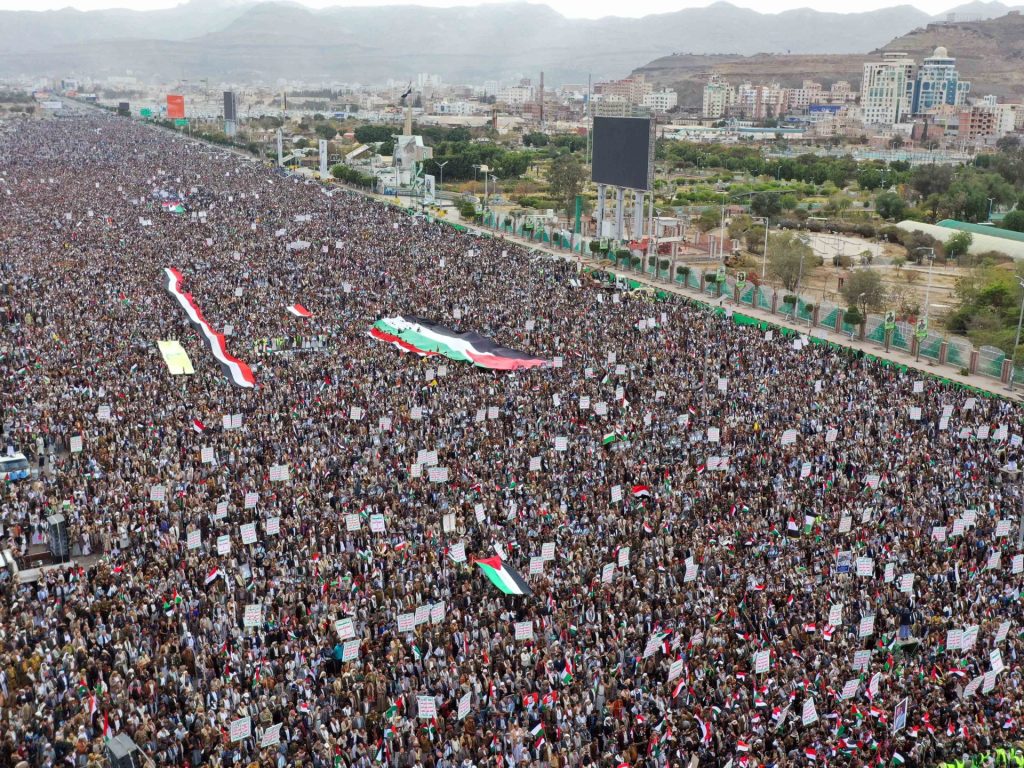 وتجمع المتظاهرون في ساحة الحرية وسط تعز عقب صلاة الجمعة، ورددوا شعارات تطالب بمحاكمة قادة الاحتلال الإسرائيلي باعتبارهم “مجرمي حرب”.