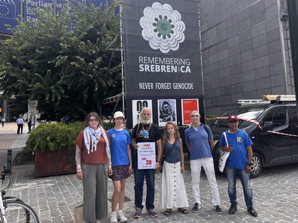 وبعد أيام جاء إلى بروكسل، ويقول “في لاهاي، كنت في الذكرى 25 لميثاق الهواء، وقيل لي إنه سيتم تكريمي. فقلت: هذه لحظة مناسبة لأعلن الإضراب. لكن المكان لا يكفي. يجب أن أكون هنا، في الشارع، أمام المفوضية الأوروبية، أمام البرلمان. إذا لم يسمعوا صراخ الفلسطينيين، فربما يشعرون بجوع جسدي”.