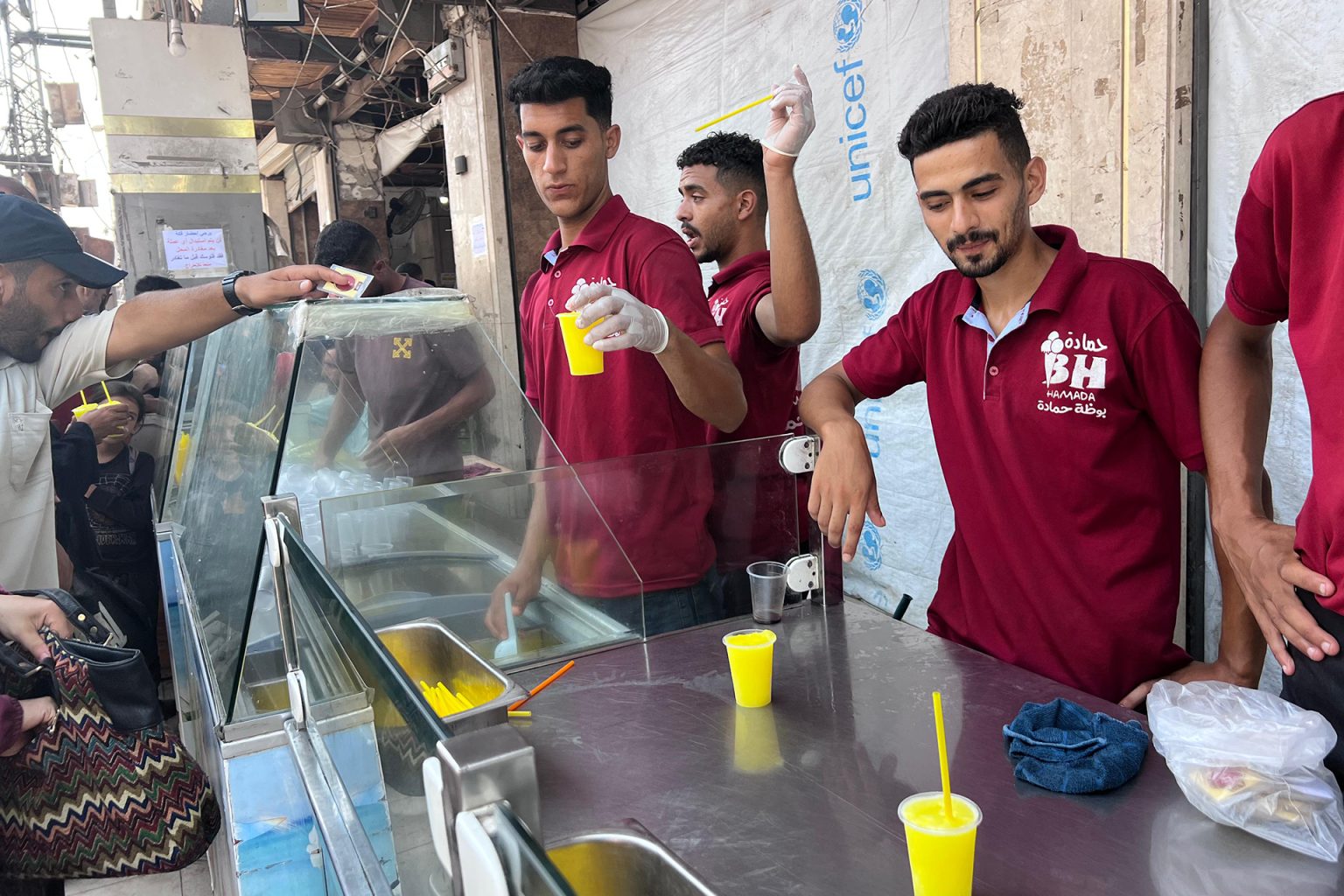 وتحاول محلات حمادة في منطقة النصيرات  تقديم جزء من الحل، إذ يتجمع حولها المئات للحصول على كأس من “البرّاد الحلو المثلج” (عصائر تحل بالماء وتثلج) الذي يخفف عنهم وطأة الحر والعطش.